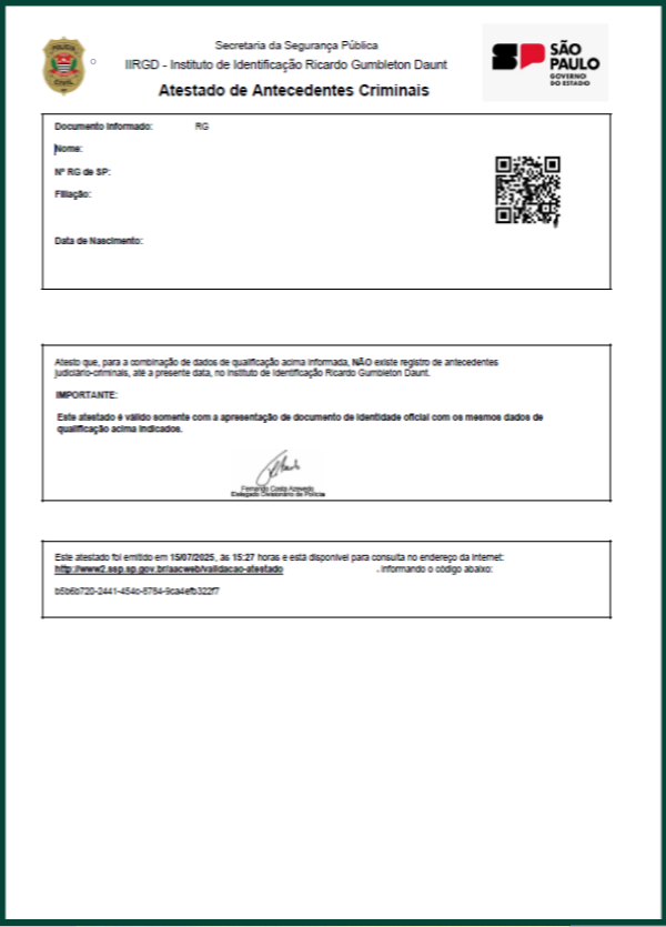 ATESTADO DE ANTECEDENTES CRIMINAIS - IIRGD DO INSTITUTO DE IDENTIFICAÇÃO RICARDO GLUMBETON DAUNT.