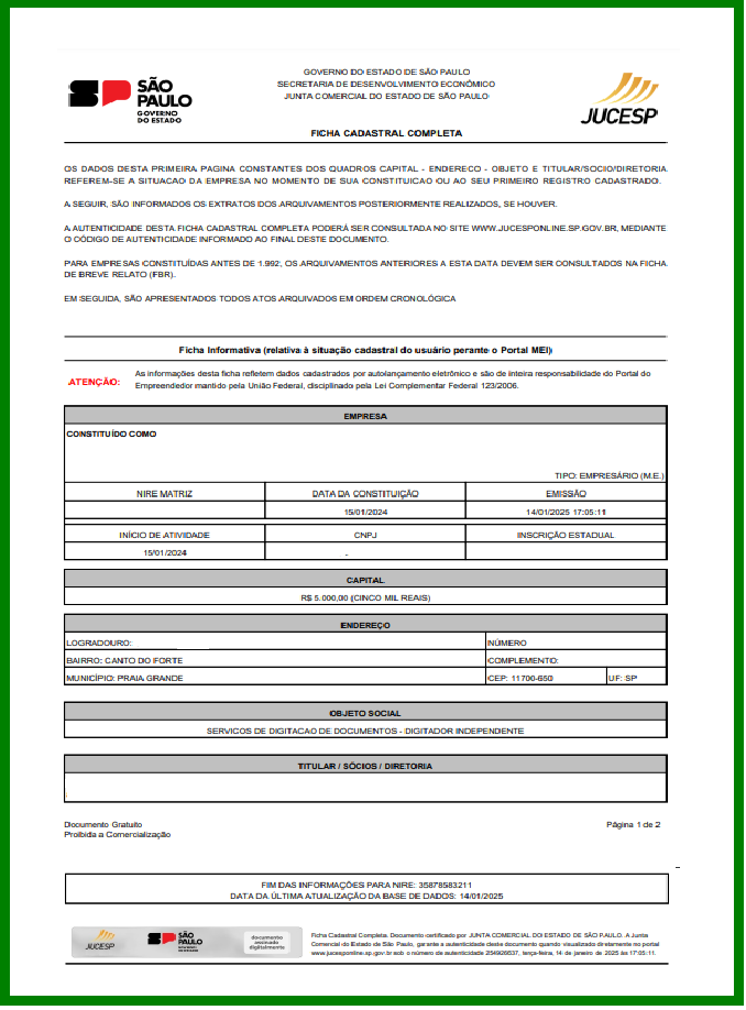 ● Ficha Cadastral Simplificada (dados atuais da empresa)