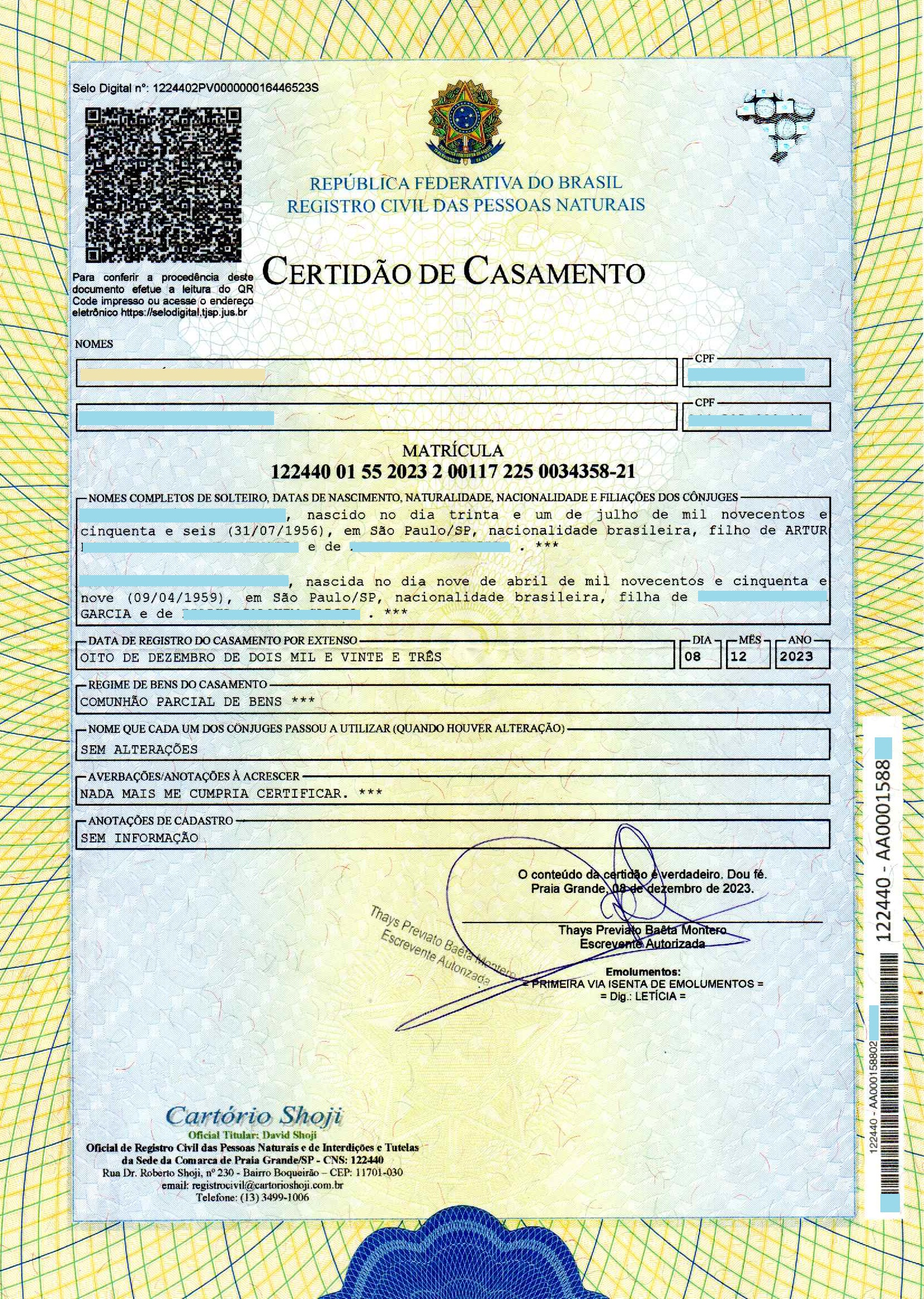● A Certidão de Casamento, deverá constar o Cartório onde foi realizado o Casamento.