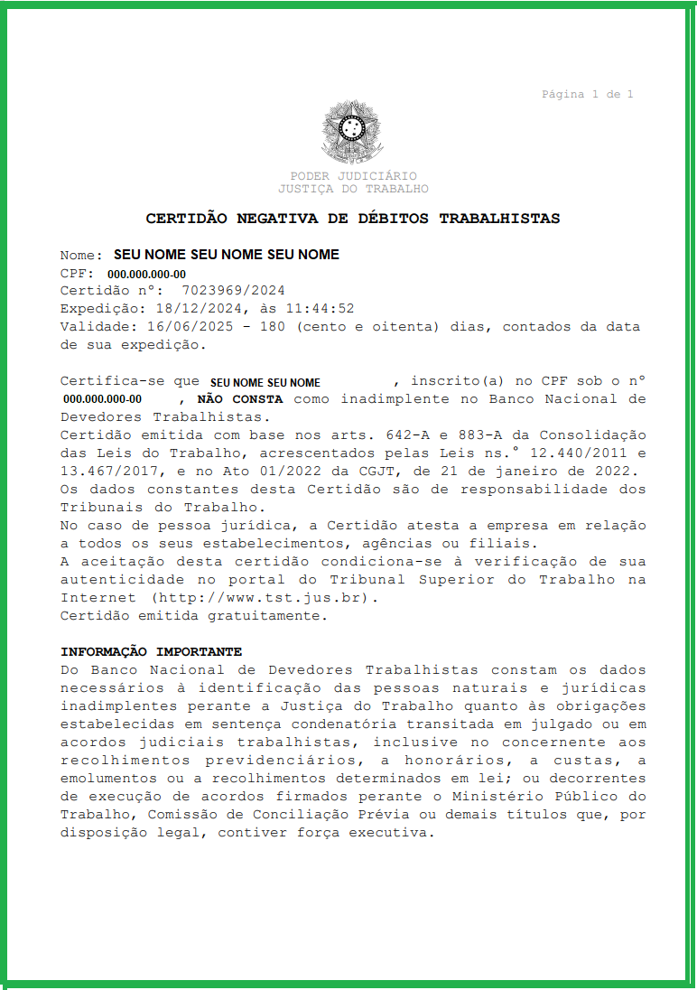 Emitida pelo ministerio do trabalho, poderá sair Negativa ou Positiva, dependendo dos apontamentos que constar no Banco de Dados de Devedores Trabalhistas sobre o CNPJ ou CPF pesquisado.