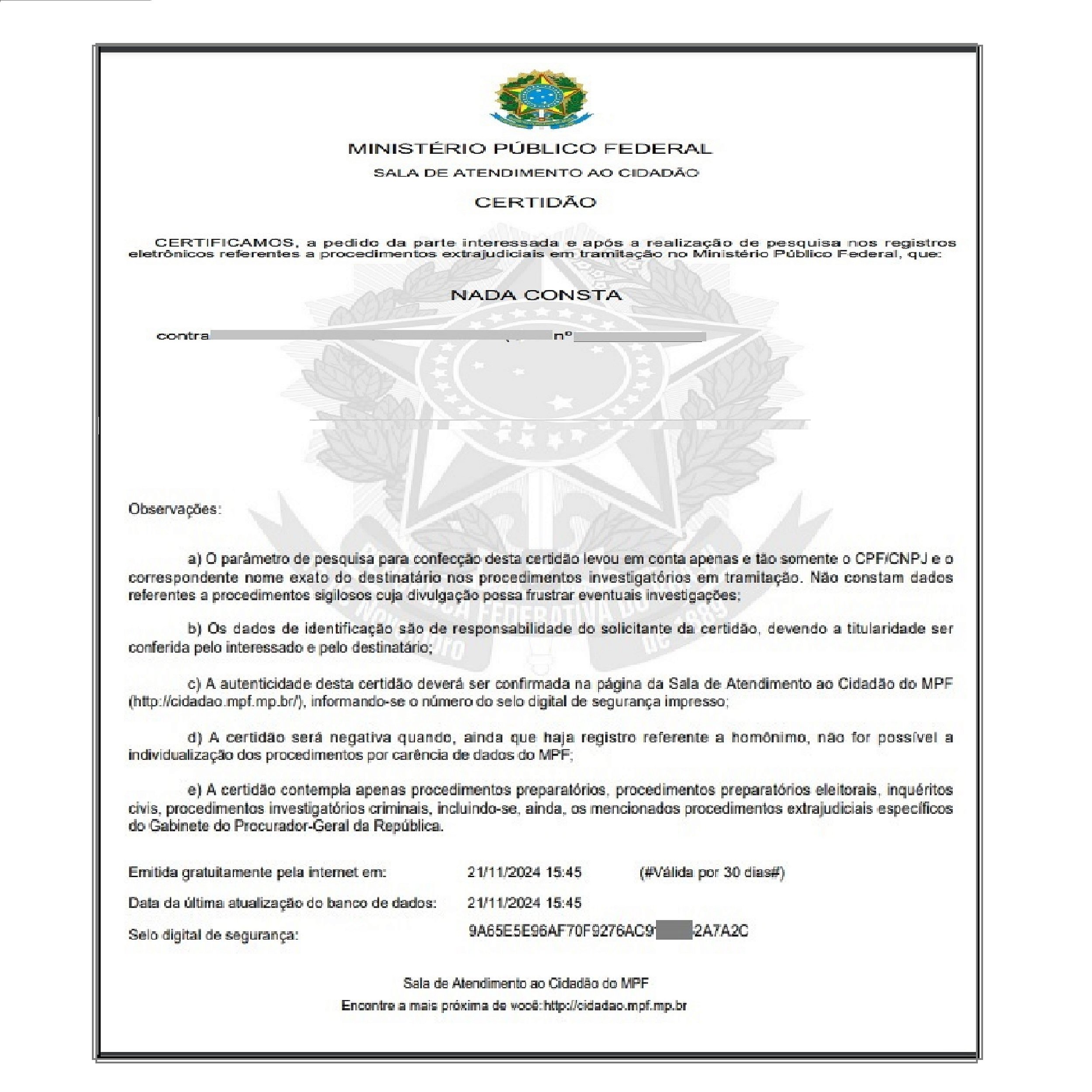 Esta certidao é emitida pelo Ministério Publico Federal e pode ser emitida imediatamente. Ela informa consta ou nada consta sobre ações em tramitações nos arquivos digitais e extrajudiciais.