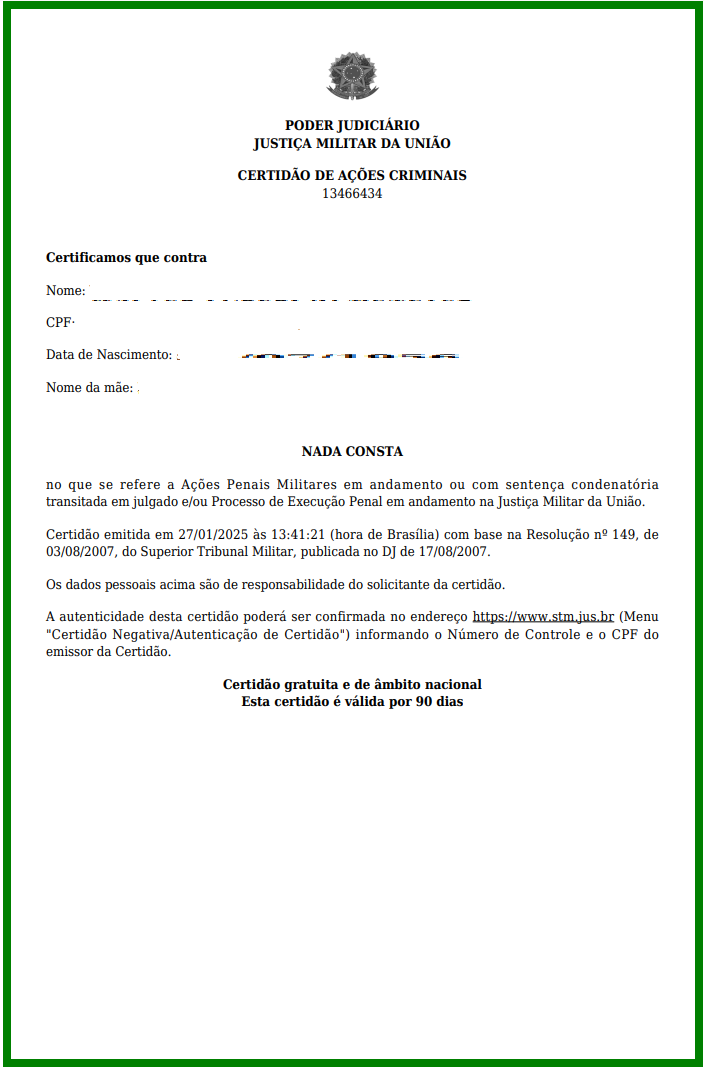 A Certidão refere-se a ações Penais Militares em Andamento ou com sentença condenatória transitado em julgado e/ou processo de execução penal em andamento na Justiça Militar da União.